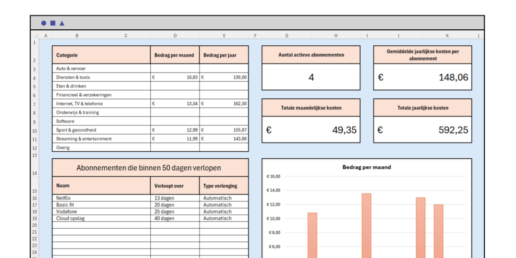 Dit template is ideaal voor iedereen die controle wil krijgen op zijn abonnementen en bewuster financiële keuzes wil maken. Het is perfect voor mensen met meerdere abonnementen, zoals streamingdiensten, software, verzekeringen of sportabonnementen.