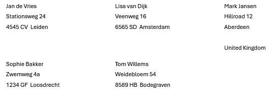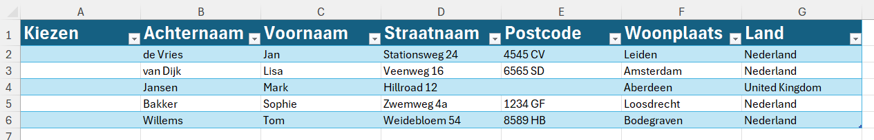 Onderstaand een voorbeeld van een adressenlijst in Excel: