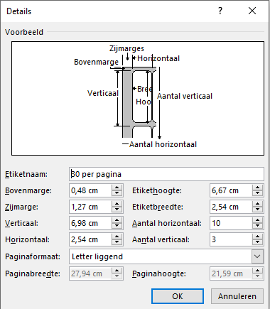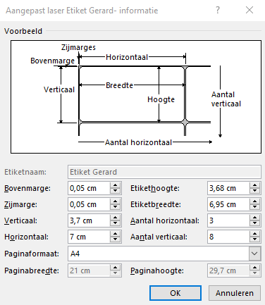 Het is belangrijk dat de afmetingen kloppen, want Word is streng met het akkoord gaan van je instellingen. In mijn voorbeeld kies ik voor bijvoorbeeld: breedte 6,95 cm, hoogte 3,68 cm, 3 × 8 etiketten per A4-vel: