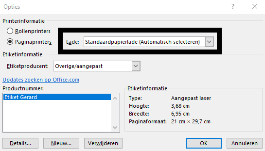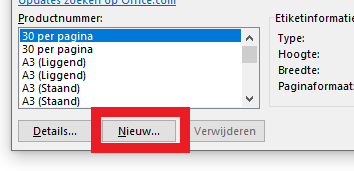 Na installatie van MS Office 2021 werkt deze instructie niet meer correct. Het aanpassen/invoeren van een labelformaat zoals wordt voorgesteld leidt niet tot het gewenste resultaat.