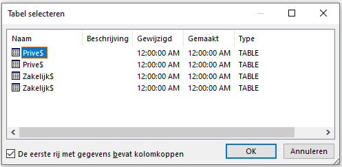 Gebruik je in jouw Excel-bestand verschillende adressenlijst op verschillende tabbladen geef dan ieder tabblad een naam. Hier heb je straks weer voordeel van bij het kiezen van de juiste tabel. In dit voorbeeld gebruik ik twee tabbladen: “Prive” en “Zakelijk”.