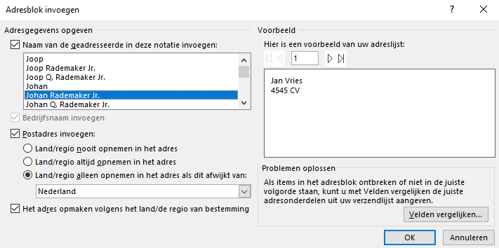 Ik kan het tussenvoegsel zoals “van” of “van der” tussen voornaam en achternaam niet in het adresblok bij velden vergelijken niet terug vinden, en dus niet in het adres krijgen. Hoe los ik dat op?