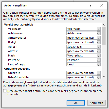 Dit pas ik aan via de optie “velden vergelijken” (rechts onderaan). Zie je dat bij jou ook sommige onderdelen ontbreken (zoals straatnaam of postcode)? Koppel dan de juiste kolomnamen uit je Excel-tabel.