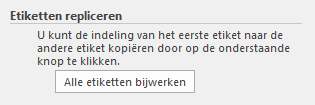 In principe heb je nu alleen de etiket linksboven opgemaakt. Om dezelfde opmaak ook voor alle etiketten te doen gelden druk je op de knop “Alle etiketten bijwerken” bij het onderdeel “Etiketten repliceren”.