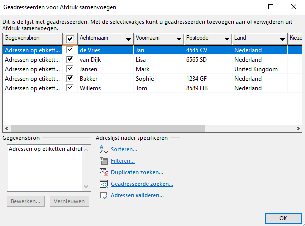 Op het onderstaande venster heb je nog de mogelijkheid om jouw adressen te sorteren, filteren, duplicaten te zoeken, een geadresseerde te zoeken of een adres te valideren.