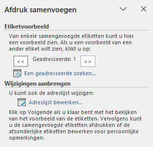 Je kunt via de opties (zie figuur 24) de adreslabels bekijken of nog een aanpassing doen in je selectie, de adreslijst bewerken (zie stap 3, figuur 16).