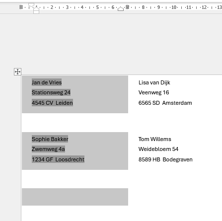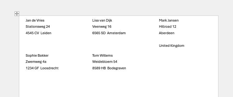 Tip: Zet je adressenlijst om naar een echte Excel-tabel via het lint Invoegen > Tabel. Zo herkent Word de kolomnamen automatisch en werkt het samenvoegen betrouwbaarder. Dit heb ik ook gedaan in bovenstaand voorbeeld.