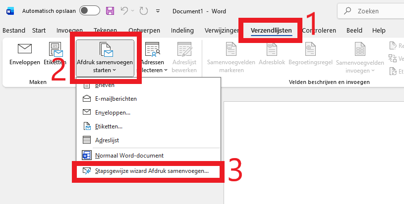 Ga eerst naar het tabblad Verzendlijsten (1). Klik daarna op Afdruk samenvoegen starten (2) en kies vervolgens in het dropdownmenu voor Stapsgewijze wizard Afdruk samenvoegen (3):