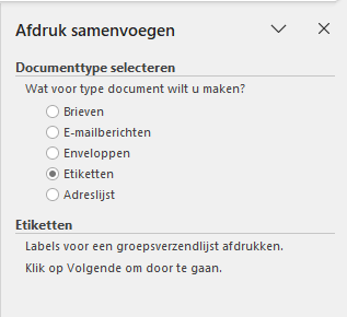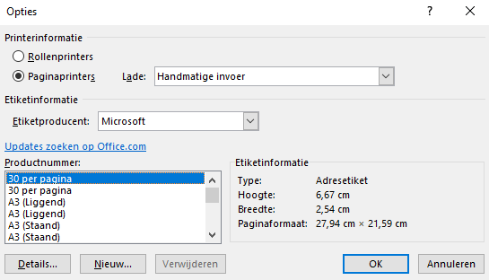 Word bevat standaard een groot aantal etikettenmerken en -soorten. Als die van jou hier tussen zit, dan kun je deze selecteren. Dit is het makkelijkste, omdat de instellingen in dat geval al correct zijn en Word direct akkoord gaat.