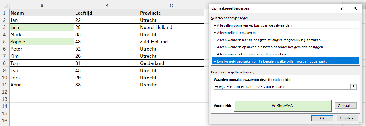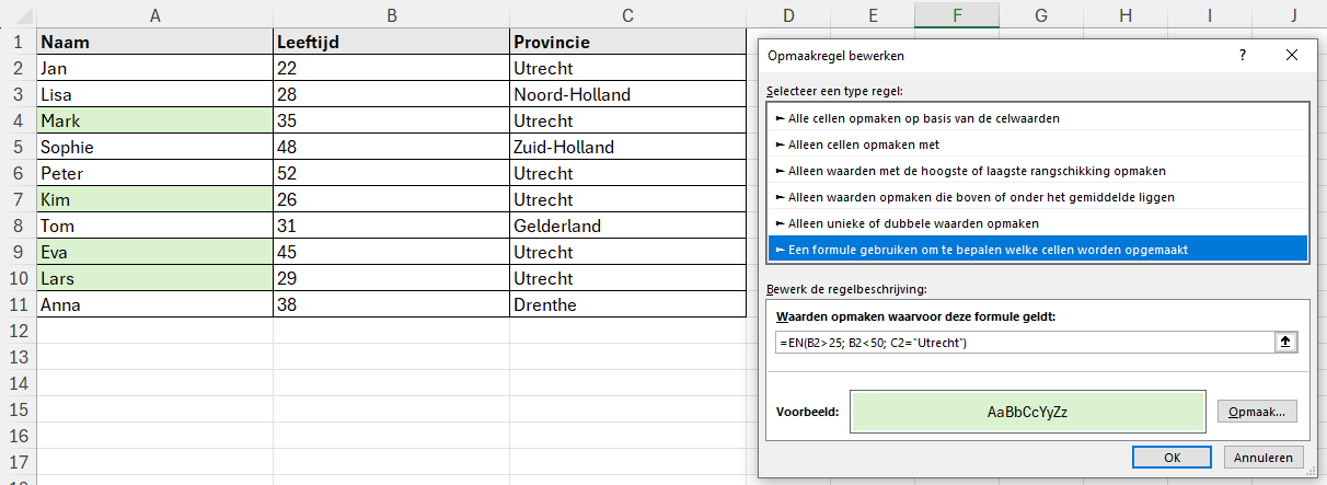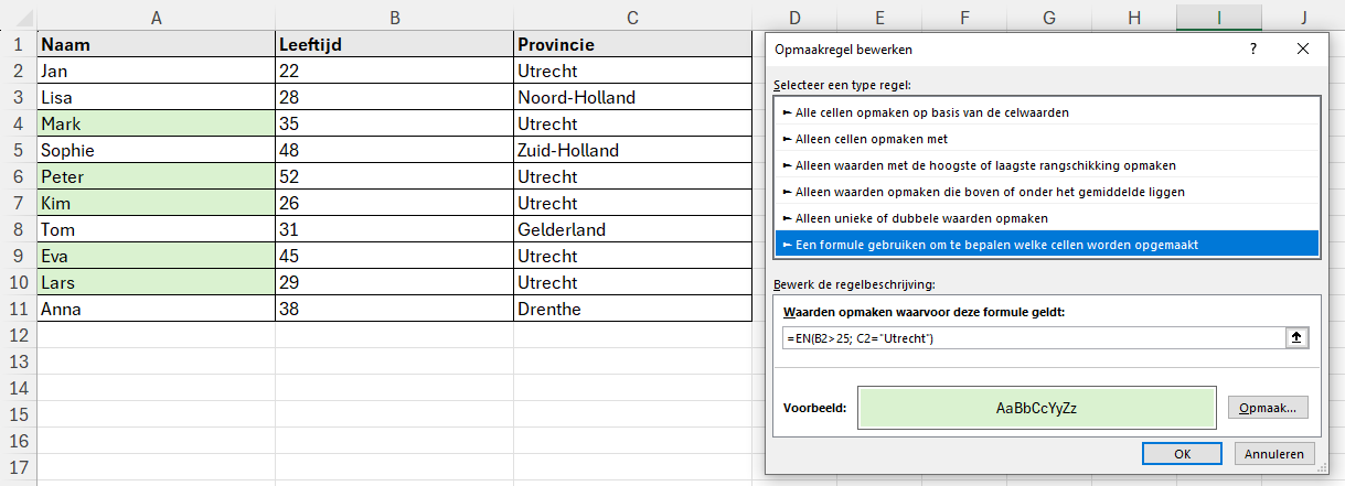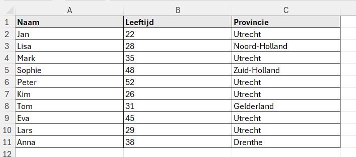 Hieronder zie je voorbeeld met verschillende namen, leeftijden en provincies: