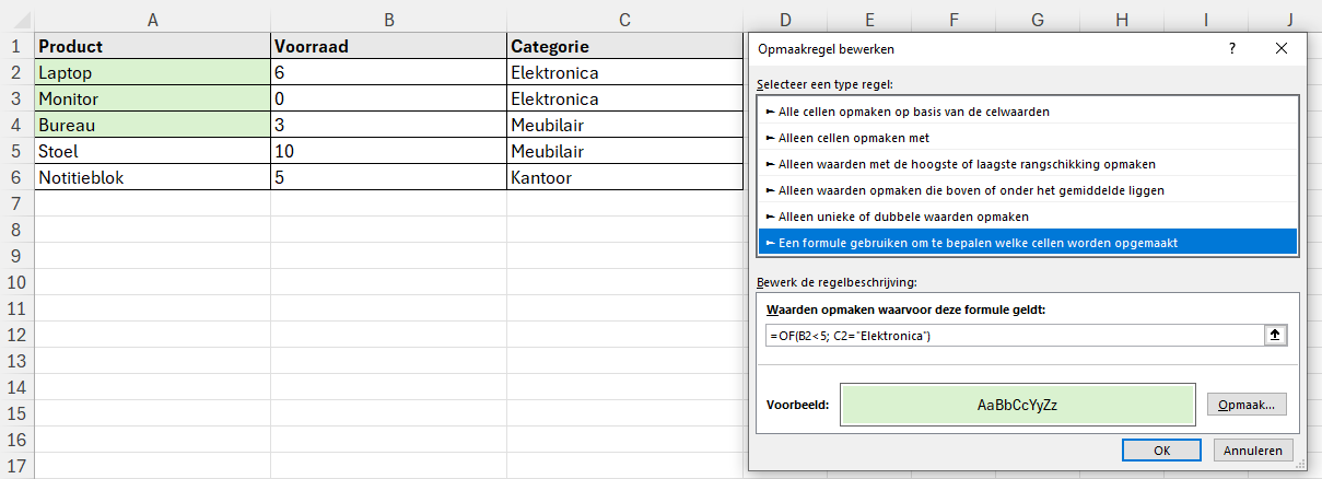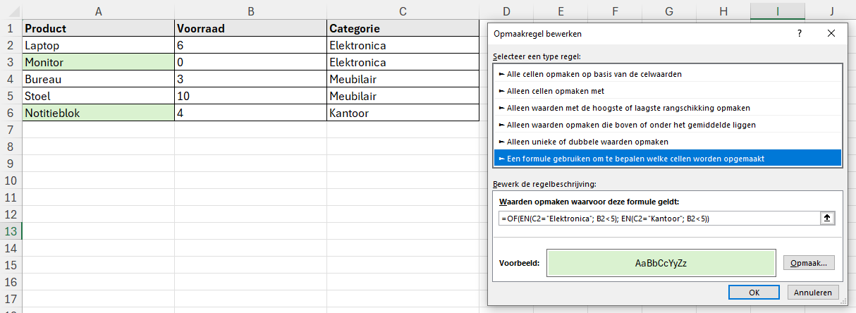 Het resultaat is dat alleen de producten worden opgemaakt die aan één van deze voorwaarden voldoen. Met dit soort formules kun je dus op eenvoudige manier opmaakregels maken die aan meerdere voorwaarden moeten voldoen.