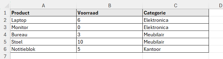 Een ander voorbeeld waarbij je de OF functie kunt gebruiken is als we bijvoorbeeld in onderstaande tabel alle producten willen opmaken met een voorraad kleiner dan 5, of die uit de categorie Elektronica komen.