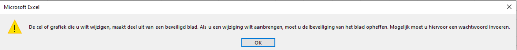 Nadat het werkblad is beveiligd en iemand een cel probeert te bewerken krijgt diegene de volgende melding te zien: