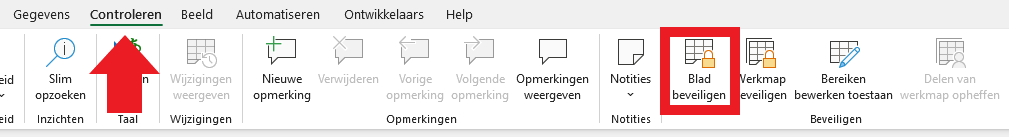 In dit artikel ga ik je uitleggen hoe je een werkblad in Excel kunt beveiligen. Om een werkblad in excel te beveiligen ga je eerst naar het werkblad dat je wilt beveiligen. Ga daarna in het Lint naar het tabblad “Controleren” en klik in de groep ”Beveiligen” op de knop “Blad beveiligen”: