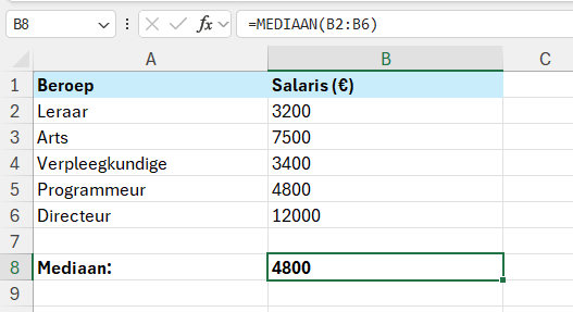 Stel je wilt het salaris van een groep beroepen analyseren. Je kunt hiervoor de de functie GEMIDDELDE gebruiken, maar de mediaan kan een realistischer beeld geven omdat het gemiddelde hoger kan liggen door enkele uitschieters. In onderstaand voorbeeld bijvoorbeeld het salaris van de directeur.