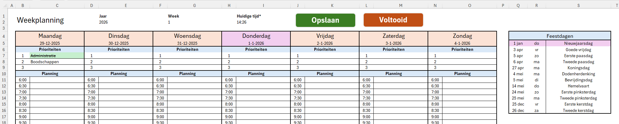 Wil je jouw taken, prioriteiten en doelen makkelijk bijhouden in Excel? Deze planner templates bevatten al formules, zodat de datums en dagen zich automatisch aanpassen wanneer je een jaar of weeknummer selecteert. Daarnaast is alle (voorwaardelijke) opmaak al ingesteld zodat alles er overzichtelijk uit ziet, zonder dat jij hier nog iets voor hoeft te doen.